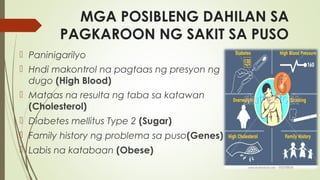 Kung may kasaysayan ng sakit sa puso ang malalapit na miyembro ng pamilya o angkan posible itong mamana. Maghanap ng aatupagin kaysa sa nakaupo o nakahiga palagi. Eduardo Tin Hay isang eksperto sa internal medicine at cardiology 50 porsyento ng mga taong may sakit sa puso ang nagkakaroon ng coronary heart disease kung saan nababara ang ating blood vessels na sumisira nito pati na rin ng ating puso.