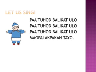 Paa tuhod balikat ulo Magpalakpakan tayo. Paa tuhod balikat ulo. Ulo Balikat tuhod at ang paa Ulo Balikat tuhod at ang paa Ang mata ang tainga ang bibig at ang ilong Ulo balikat tuhod at paa.
